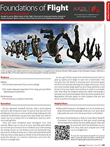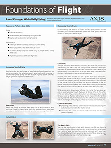Angle flying—also called tracking, atmonauti, zooming, tracing and many other names over the years—involves creating a horizontal flight path (as opposed to “falling down the tube”) by manipulating the pitch of the body. The challenge when angle flying is not just learning how to fly your body but also how to navigate the space around you.