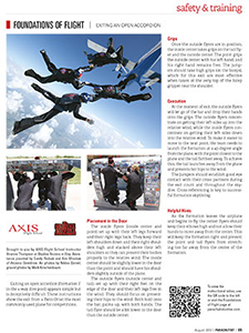 Exiting an open accordion (formation F in the 4-way dive pool) appears simple but is deceptively difficult. These instructions show the exit from a Twin Otter, the most commonly used plane for competitions.
